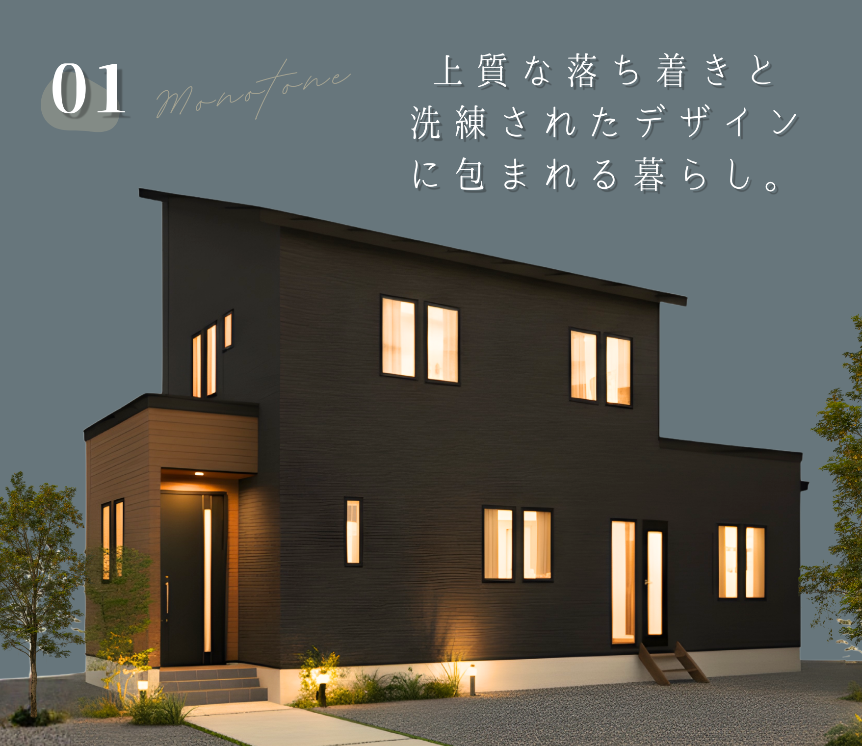 黒×木目の外観が印象的な、都会的で洗練された佇まい。延床37.54坪のゆとりある空間に、モノトーンでまとめたかっこいい内装。