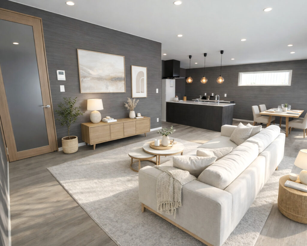 段差のないフラットな動線と、家族の暮らしを支える豊富な収納で、日々の「ちょっとした不便」を減らした住まいです。