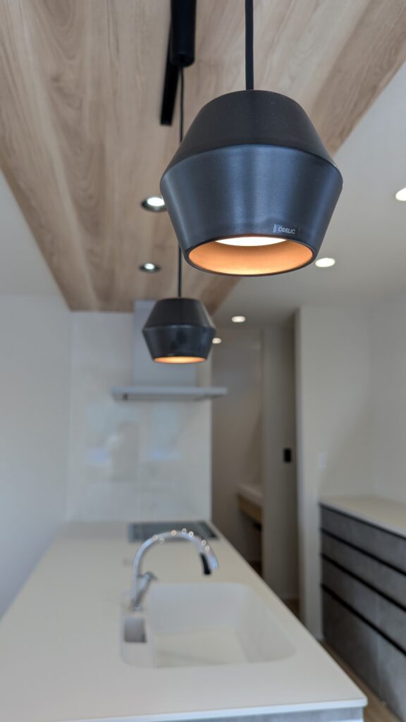 白と木目を基調としたナチュラルな空間に、アイアンや石目調のアクセントカラー(黒・グレー)をプラス。さらに天井にも木目をあしらった、モダンで落ち着く空間です。