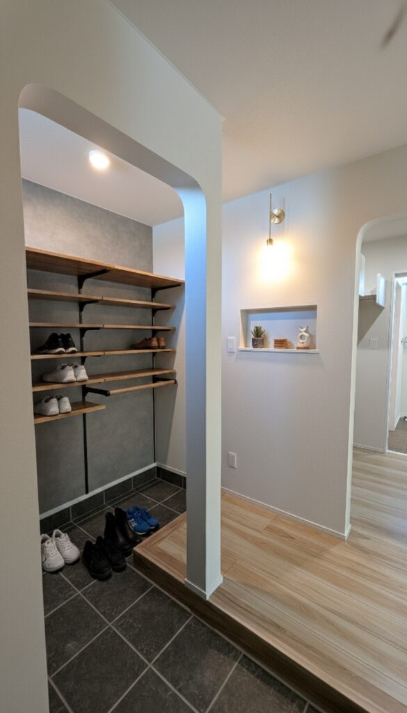 玄関横には大容量の土間シューズクローク(シュークロ)を配置。コートを脱いだらそのまま1階のファミリークローゼットへ向かえる動線です。