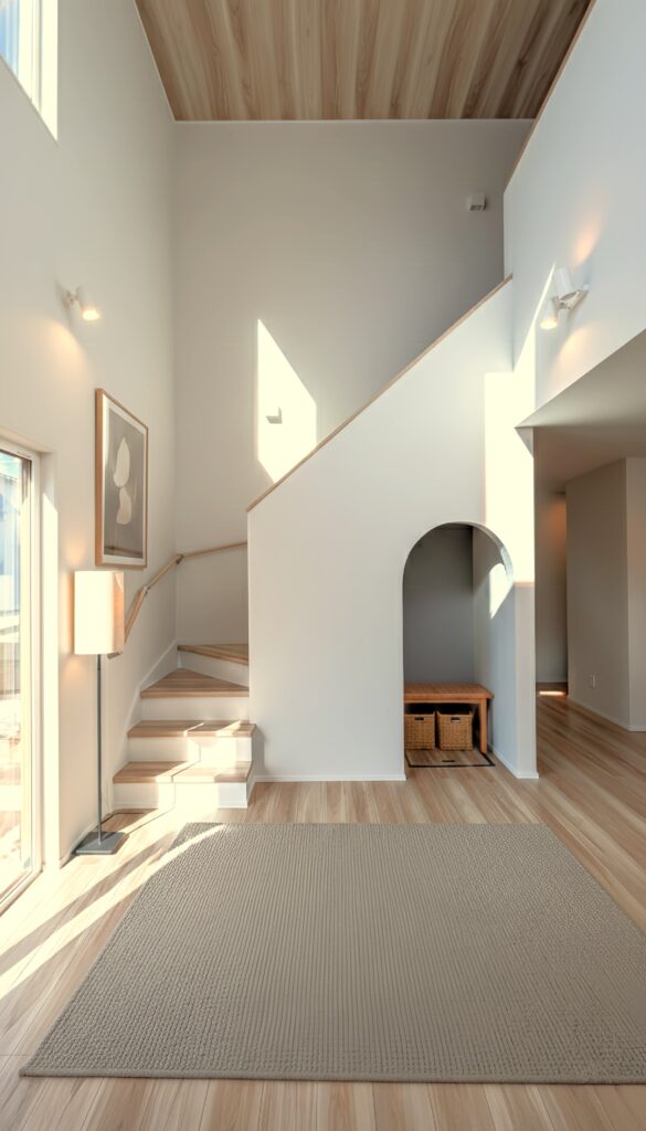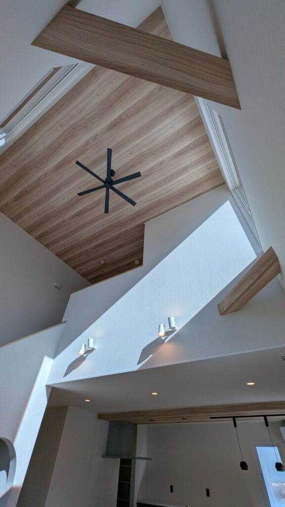 リビングの吹き抜けは12帖とは思えないほどの開放感。1階と2階がゆるやかにつながり、どこにいても家族の気配を感じられる設計です。