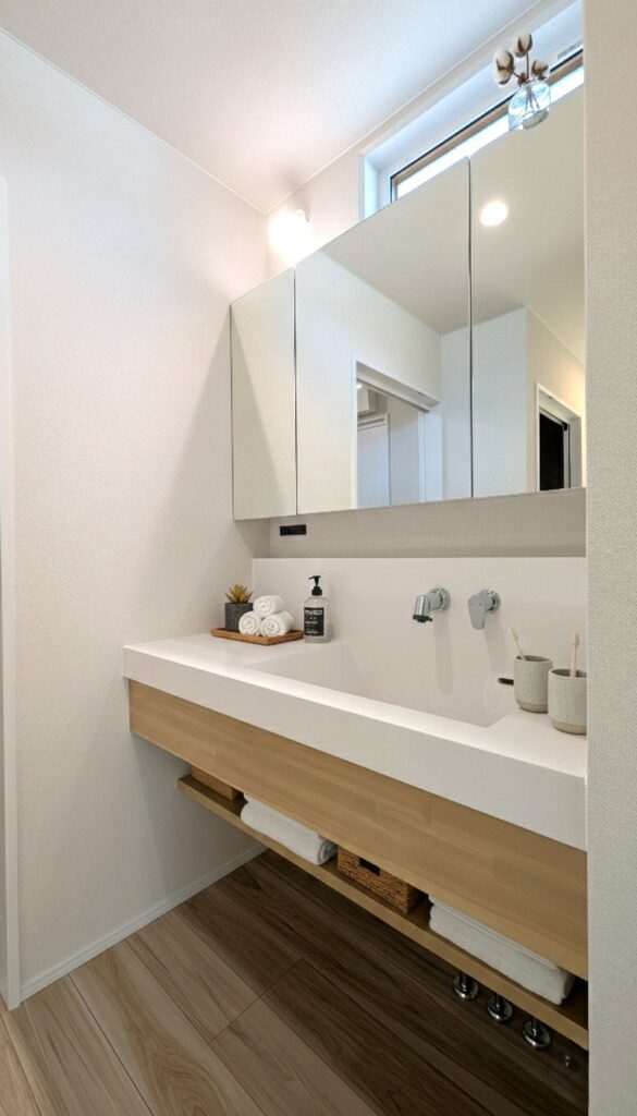 洗面台は造作仕様で大きな鏡を採用。さらに、キッチン周りにはパントリー、階段下にはニッチ収納もあり、家の各所にオーナー様のこだわりと実用性が両立したポイントがあります。