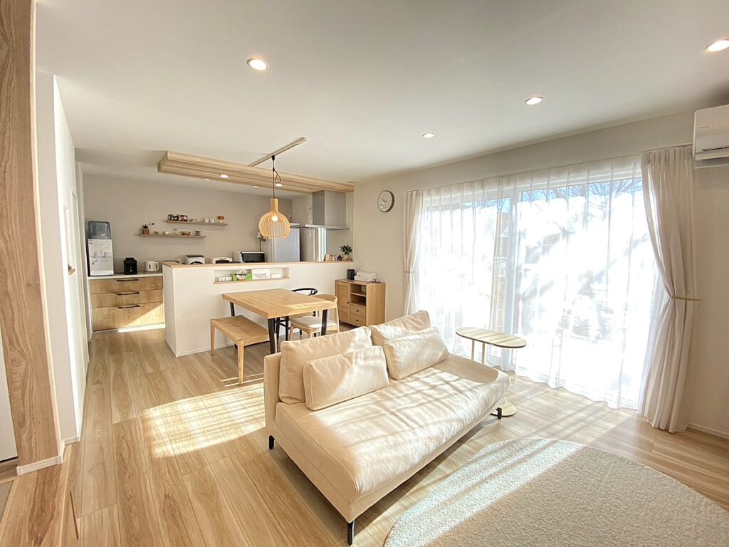 木目×ホワイトが調和し、光あふれる大開口窓のリビングがやさしい空間を作り上げています。