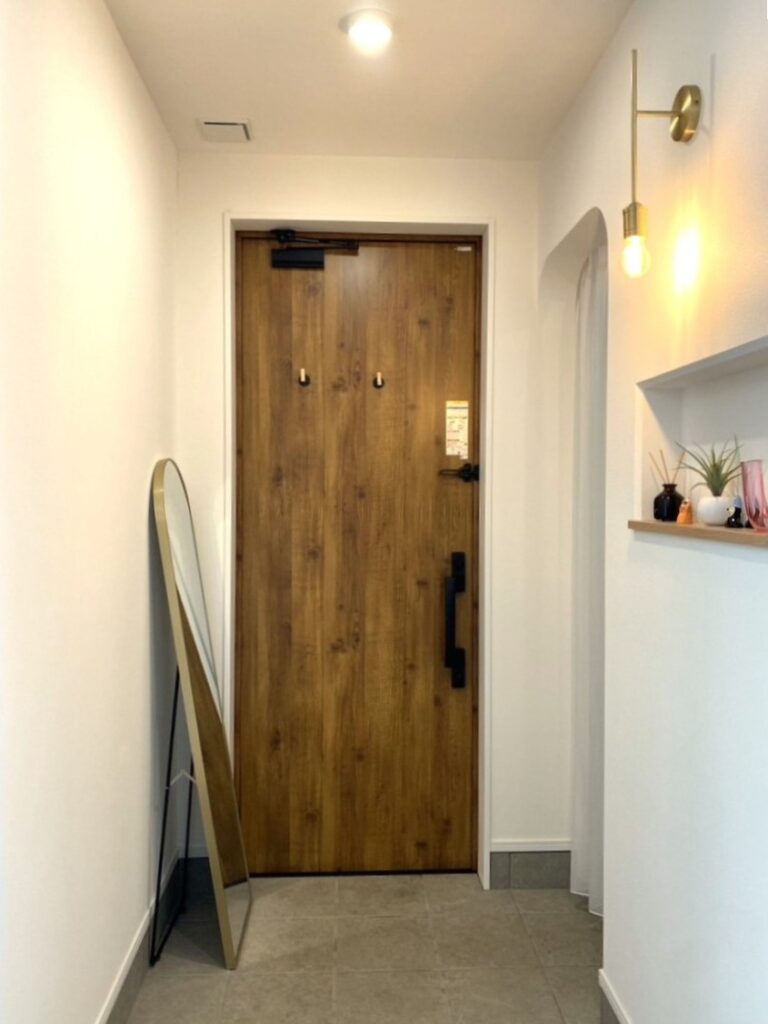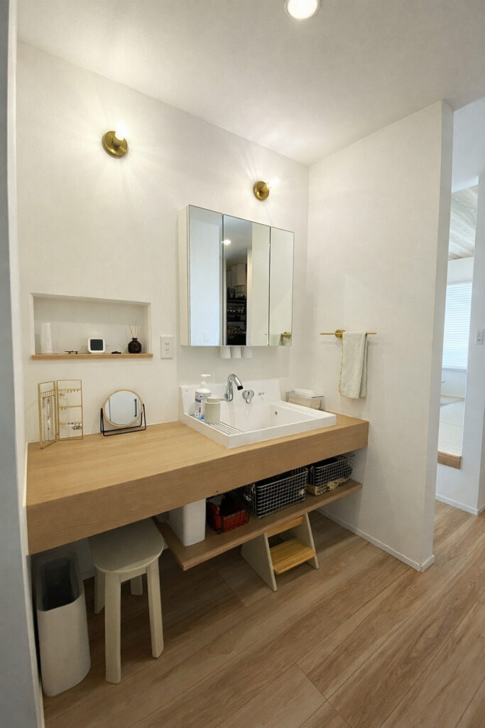リクシルのカスタムバニティを使用した洗面台と玄関スペースは、ナチュラルテイストにゴールドを差し色にしたインテリア。帰宅するのが楽しみになります。
