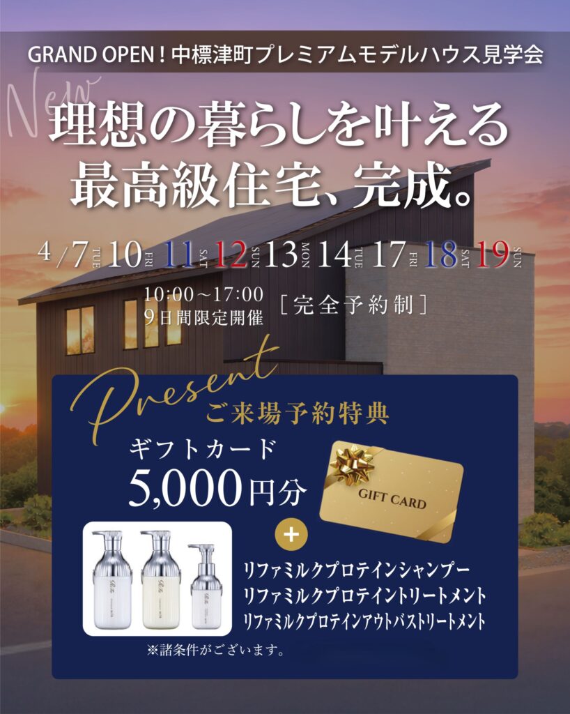 ※初めてのご来場で、入居予定の方揃って来場されること・予約後の事前アンケートに全てお答えいただくこと・1年以内に新築一戸建てを検討していること・1家族1商品1回限り・来場特典の対象は前日までのご予約の方が対象となります。景品のお渡しは初回来場時、弊社の新築住宅に関するご説明をお聞き頂き、次回ご来場時となります