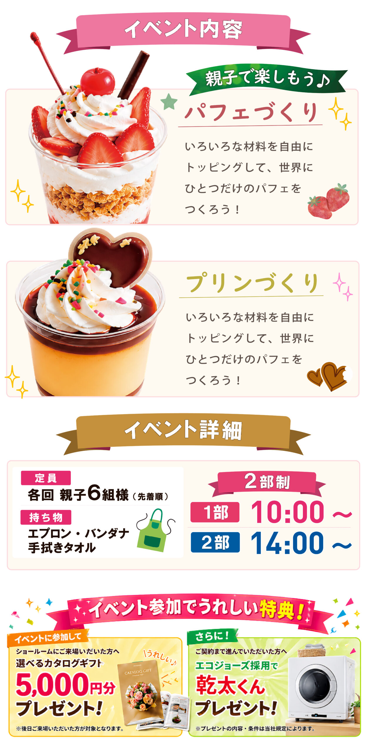 イベント・キャンペーンのプレゼントは、1名様(1家族様)1回限りとさせていただきます。 未成年者様のみのご来場は対象外とさせて頂きます。 アンケートにご協力して頂く事が条件になります。 当社からの予約確認、確定のご連絡を以て受付完了とさせていただきます。また、当日のご来店予約については、直接ご連絡いただきますようご協力お願いいたします。ご予約無しでもご来店頂けますが、担当者が不在の場合がございますので、予めご了承ください。 1年以内に弊社施工エリア内にて新築住宅をご検討されている方に限ります。