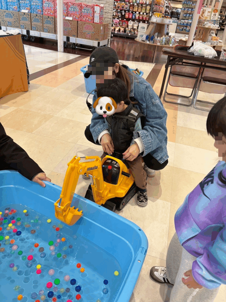 機械に乗って、スーパーボールすくい!機械に乗れるだけで満足の息子でした。笑