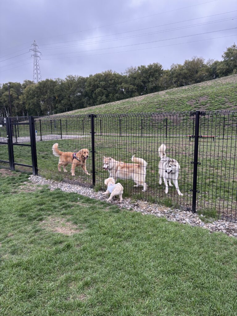 帯広で行ったドックランの勝てない大型犬に向かっていく我が家の怪獣の写真と、